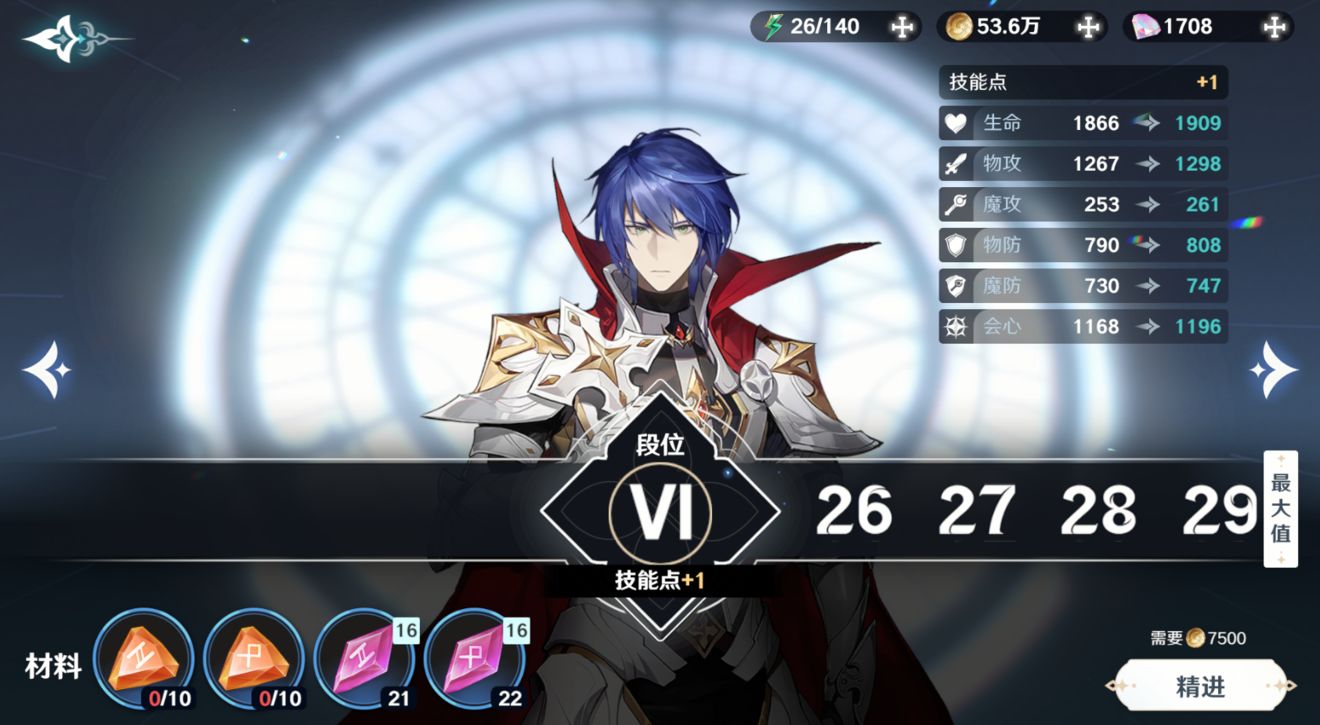 等级提升除了提升属性之外,每5级还需命运回廊产出的道具进行精进,精进之后,可以额外获得1个技能点,用于点选技能树。