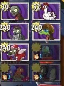 2、同样,游戏为对战双方都开放了8款能够上场的僵尸,可使用的僵尸是固定的,分别为普通僵尸、僵尸鸡、读报僵尸、机枪豌豆僵尸、全明星僵尸、护盾僵尸、章鱼僵尸以及大汉铜人僵尸。和植物卡槽一样,僵尸卡槽的解锁顺序同样受回合的影响,随着回合数的增加,会逐步解锁更为强大的僵尸槽,在僵尸卡片的左下角会提示该槽位解锁还需要的回合数。