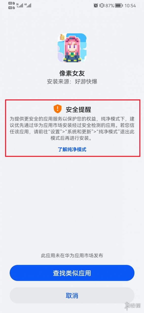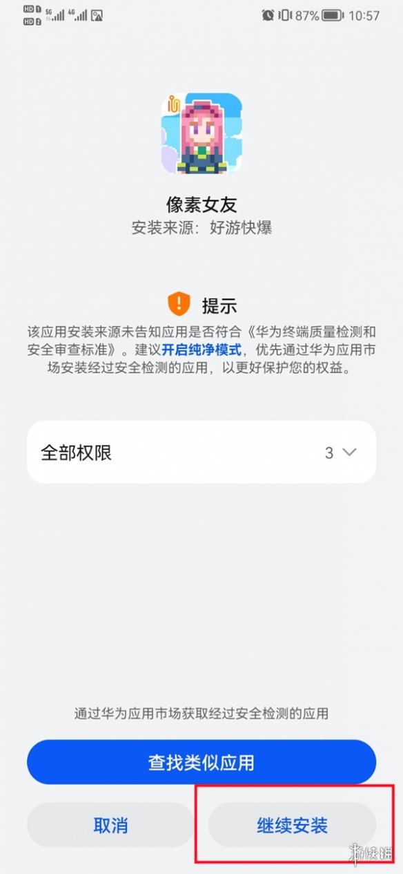 ②新版“纯净模式”已取消仅能从华为系统自带的应用市场内进行安装软件的限制,点击“继续安装”验证自己华为手机的“锁屏密码”即可安装游戏~
