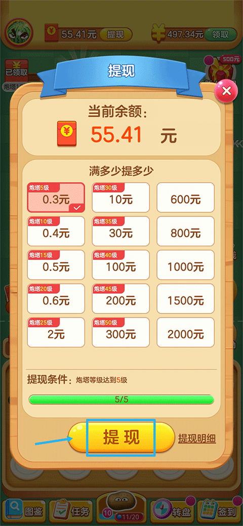 5、当炮塔等级达到可提现红包的标准时,挑选能够提现的金额,然后点击提现就行。