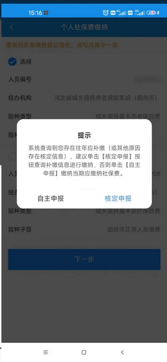 选择本次缴费险种,点击【下一步】查询应缴费信息,
