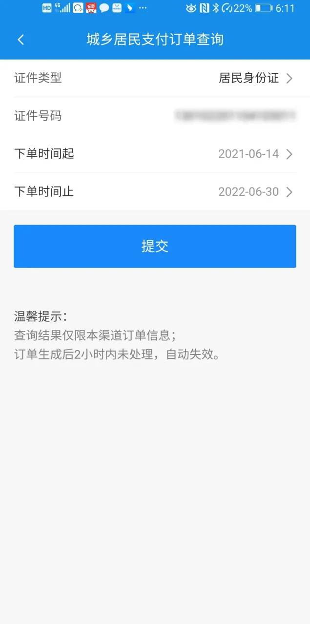 输入证件号码,下单时间,单击【提交】按钮