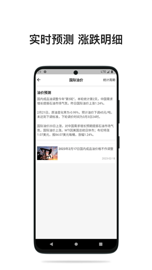 1. 用户不仅能够查看全国各地的实时油价行情,还能查看89#柴油、92#汽油、95#汽油、98#汽油、10#柴油、20#柴油、35#柴油的历史价格变化曲线。同时,依据国际原油价格数据(涵盖美国WTI原油油价与布伦特原油价格),实时预测当前油价走势,并展示涨跌明细。