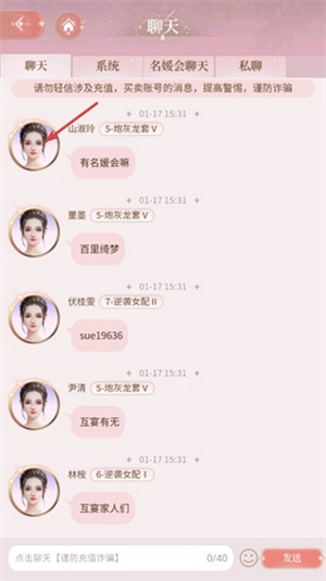 3、在聊天窗口中点击玩家头像,打开玩家的明信片