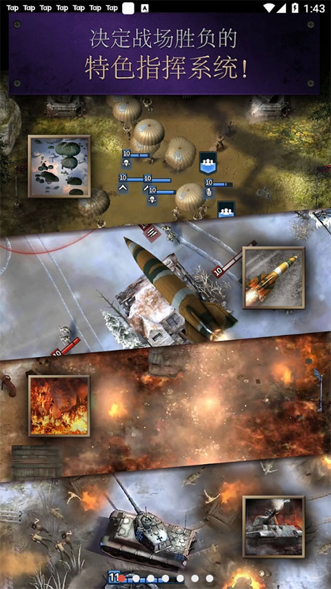 1、请选择各阵营准备好的支援战略、空降战略、要塞化策略、突击策略等具有特色的指挥特点,积极运用强大的指挥技能!战略即是胜利的关键。