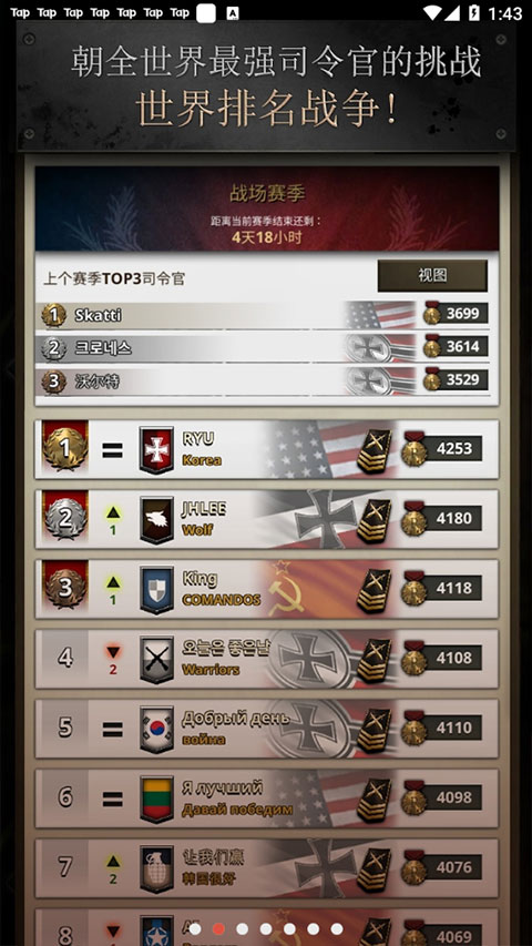 6、随着战斗胜负,可能会获得或失去排名分数。与全世界玩家一起激烈地争取全世界最强的司令官地位吧。
