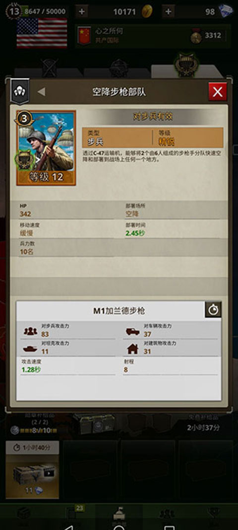 在空降流玩法里,最后的补牌环节对完善整个战术至关重要,要是缺了这一环,空降流就始终存在缺陷。在游戏中,哪怕英雄士气高昂都并非必不可少,但空降步枪连队绝对不可或缺。它堪称勇猛之路二战游戏里浑水摸鱼的高手。前面提到过,空降部队虽配备反坦克武器,可自身面板属性较差,四人编制虽是优势,却难以对精锐步兵造成有效打击。此时,就得借助人多势众的力量,从空中再次降下两个六人组成的步枪连队,它们能迅速压制战场,击杀敌方精锐步兵,再配合空降部队自带的医疗兵,将压场效果发挥到极致。而且防御塔的攻击模式比较单一,打死一人后,很容易将攻击目标转移到其他步兵身上,这相当于变相为存活的空降部队提供保护,让他们有更多机会使用 M1 无后坐力炮,同时也能为残血坦克吸收前排火力伤害。总之,这支部队在空降联队手中用途广泛,能玩出诸多花样,上限极高。这里还有个小秘诀,要是采用人海战术,可利用这支部队和空降部队营造出类似 “人造 D - day” 的效果,非常有趣。不过,如果步兵联队专注于建筑玩法,就无需使用这张牌。此外,这张牌还能承受防御塔的伤害,配合爆破工程兵扔出背包炸弹,在开局突袭时能取得意想不到的奇效。