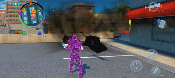 2、一共有2X2个恶棍会来搞你单纯依靠火力压制就能轻松消灭敌人,如果你的装备不行也可以像图56那样,直接开车去撞,虽然拿不到三星但是过关很轻松。