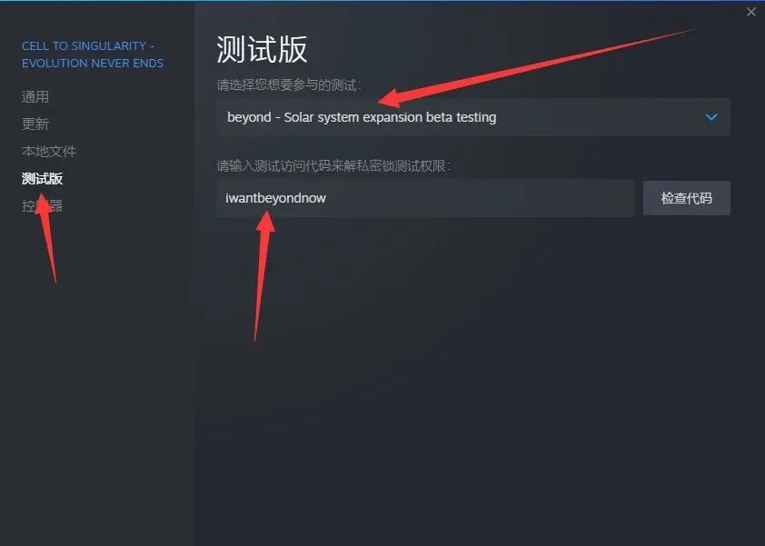 2、传输结束后,开启电脑,打开steam,在商店中搜索Cell to Singularity,这便是原版的免费游戏。下载完毕后,在游戏库中右键点击该游戏,选择属性,点击测试版,输入测试代码iwantbeyondnow ,接着检查代码,在上方选项里挑选字母最长的那个测试版。