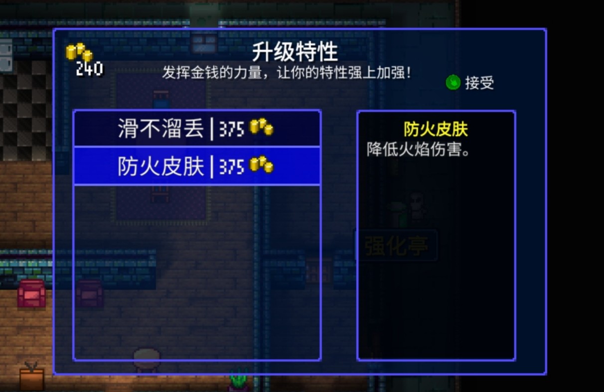 降低火焰伤害,火焰伤害会降到10→6→0(火焰伤害+不会受到伤害并且会立马熄灭火焰)用处不是很大。