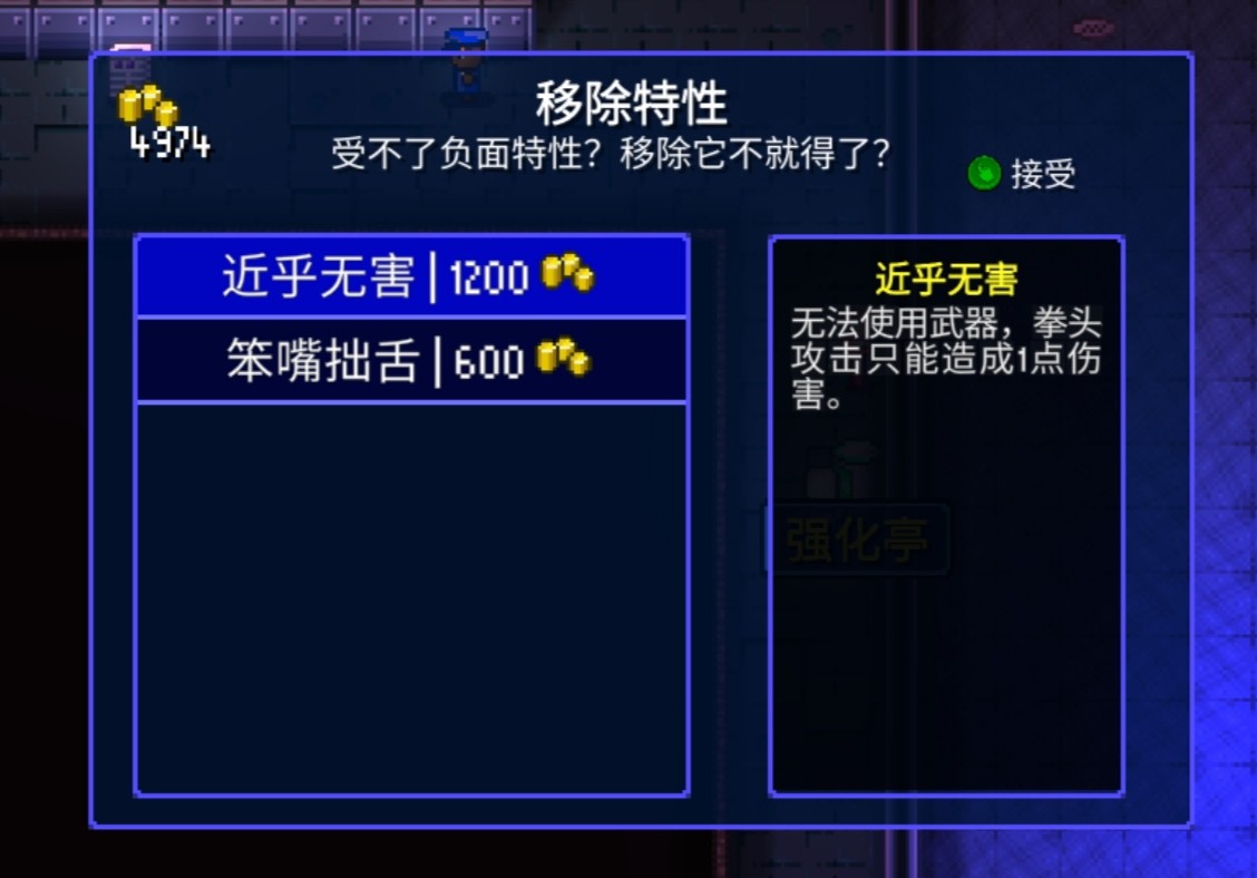 你将无法使用任何武器,这里的武器包括所有能够手持的道具,可以理解为我们拿不了任何东西,这个技能是全游戏负面效果最大的技能没有之一,移除价格非常昂贵,并且无法交换,其他NPC受到你的伤害始终为0