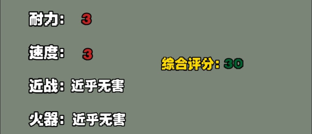 外星人的属性可以说是游戏中比较特殊的了,耐力和速度方面都是比较出色的,在游戏中可以算作中上水平,不过在近战和火器方面可以说是全游戏最差没有之一,近乎无害可以说是最差的数值了,有了这个属性,就注定这个角色的战斗能力几乎为0,因为我们是使用不了任何武器的,并且空手攻击不管我们使用巨人药水还是其他增益药水,对手所受的攻击始终为1点,也注定了外星人的打法只能围绕着自己的特殊能力,属性加点方面耐力>速度。