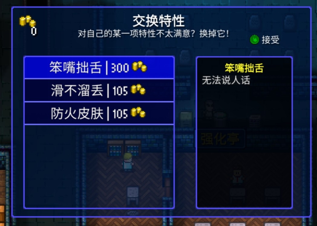 交换技能只会交换同一个档位的技能,与笨嘴拙舌同一个等级的有小精灵和和平主义者,个人不建议交换,如果到后期实在还没有翻译器,可以赌一下,赌到和平主义者大赚,赌到小精灵完蛋,滑不溜丢和防火皮肤是同一个档位的,不过这个档位的技能比较多,最具有代表性的如凌波微步、爆炸幸存者、人多力量大(更安全)因为数量繁多所以每层只能交换某几种。防火皮肤不升级的话几乎没用,可以花105金币去交换,滑不溜丢对于外星人还是非常有用的,不推荐交换。