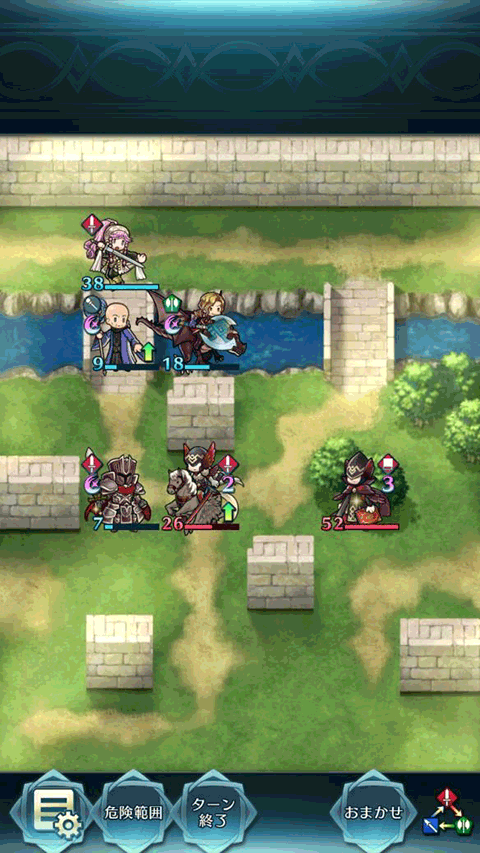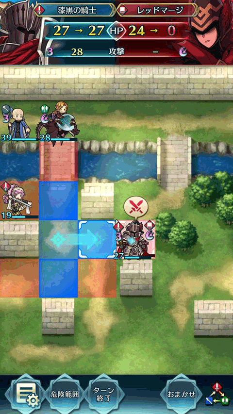 纳西恩飞到墙角卖表情包。剩下三人如图站位。敌方回合,骑法会被+4攻的小黑反死,拓海先动。小黑反不死拓海,左边三人就围成一团,下一回合处理。