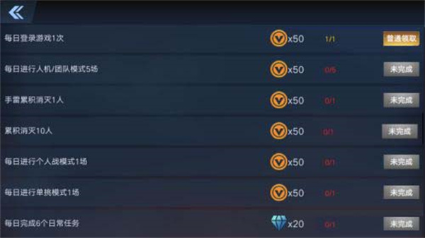 2、每日完成一定任务可以领取奖励,如每日人机、团队对战、手雷累积消灭1人,都可以可以获得金币。
