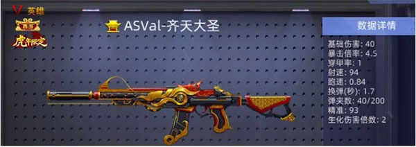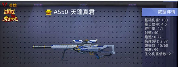 模式禁用情况:在战队赛里,爆破模式、生化模式以及终极生化模式中,此技能无法使用。其基础伤害为130 ,暴击倍率达4.5 ,四肢倍率是0.85 ,穿甲率为1.1, 射速为50 ,跑数为0.77 ,换弹时间(秒)为2.37,弹夹数是15/60,精准度为99 ,生化伤害倍数为2。 这款武器与前面提到的ASval - 齐天大圣一样,同属虎年限定的西游系列武器,都是凭借前辈的基础而崭露头角。它的外观采用银色与蓝色搭配,将科技感与隐匿性完美融合,手感极其出色。作为狙击枪中的“老大哥”,其射速在狙击枪领域也相当突出,进行甩狙操作时会带来超爽的体验。