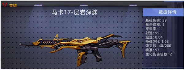 基础伤害:39、暴击倍率:5、穿甲率:1、射速:95、移速:0.84、换弹时间(秒):1.63、弹夹容量:40/200、精准度:93、生化伤害倍率:2。这款随着新版本上线的全新武器,可通过宝箱抽奖获取,伤害与主宰M4圣兽相近。它的后坐力极小,连射时弹道稳定,不会四处飘散,是一把性能很稳的枪械。不过,建议微氪和零氪玩家不要轻易尝试抽取,因其抽取难度极高。