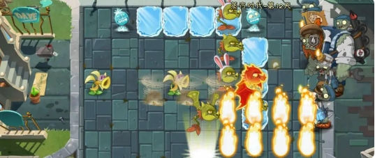 技巧:这关要利用地形,其实我们只在打一条路!我们可以看到,这关有三条紧密的夹板,所以说,我们利用弹簧豆,能直接清除两排僵尸,再利用寒冰射手大招的强大输出,直接通关,且注意海鸥僵尸,利用玉米大招,全部清除。