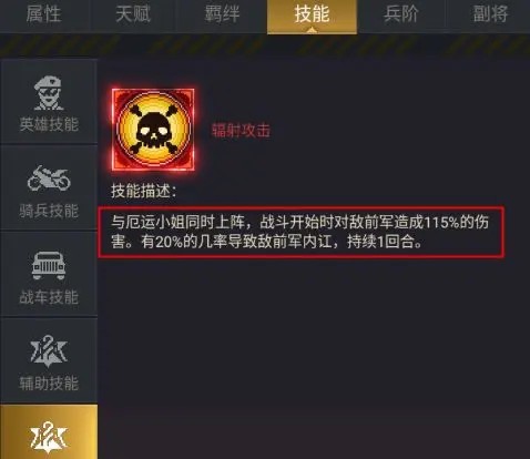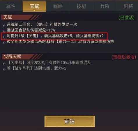 天赋:每位英雄都具备独特的天赋技能,在此需关注英雄的天赋与固定技能之间是否存在加成关系。以末日邮差为例,每当【突击】提升1级,骑兵的基础攻击就会增加5,基础防御则增加2 。