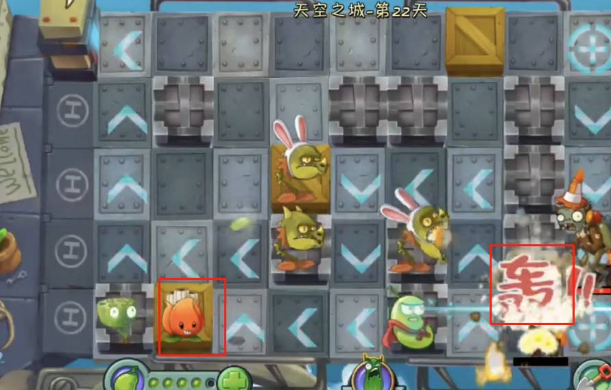 1、先说天空之城22关的简单打法。玩家开局要在第六列放置如图所示的第二种植物,接着对其进行升级,一直升级到喷火龙。这种植物能够攻击三排的僵尸路线,是前期和中期的过渡关键。待升级完成后,继续升级,使其变为可轰炸的植物,如此便能在后方进行远距离输出。