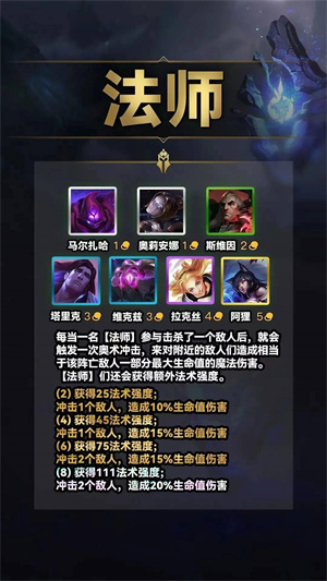 战斗开始时,前2排的友军获得200/350/400/550护盾,持续8秒。后2排的友军获得20/30/40/55法术强度。