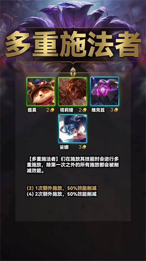 多重施法者会额外施放技能1/2次。额外技能效果降低50%。