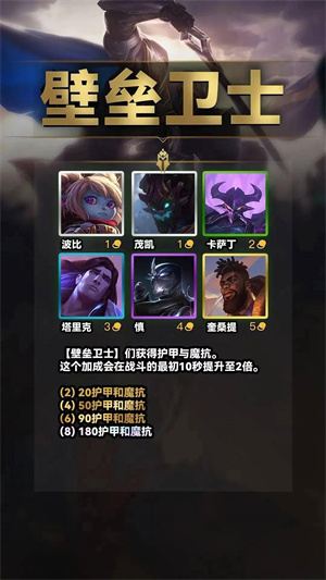 每回合,你最强的1/2/3/5名德玛西亚英雄会各获取一件随机光明装备,同时这些英雄会为相邻友军提供5/25/80/200点双抗,该双抗效果不可叠加。