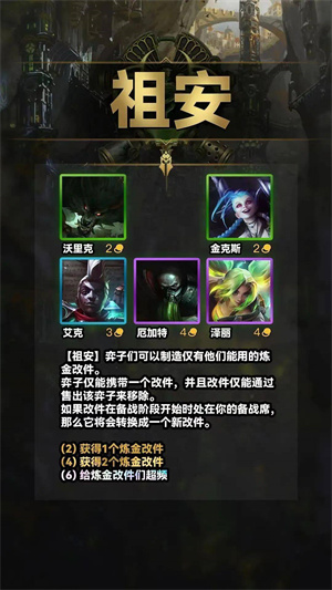 祖安英雄会获得1/2/3个随机的炼金科技效果,并且只能由他们使用。这些效果只能通过出售英雄移除。