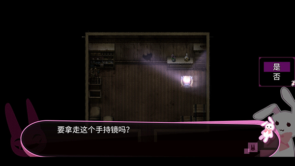 6、依照剧情,喵露朵露薇将会苏醒。如图片所展示的,首先走到桌子跟前,这时会发现玩偶不见了,接着查看右边的镜子,最后从门这里离开。