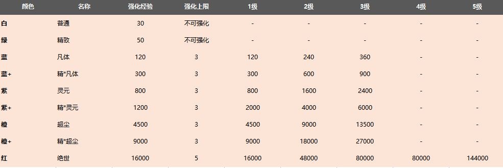 b、白绿品质不可强化,蓝~紫+强化等级上限为3,橙~橙+为5,红(绝世)也为5