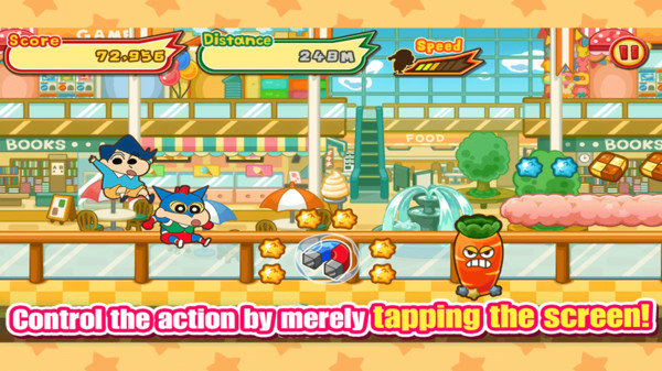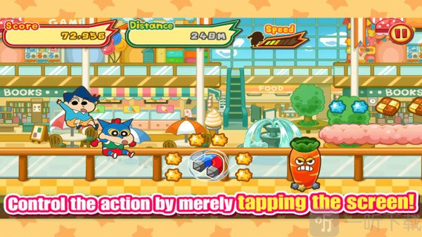 2. 蜡笔小新鼓足劲儿奋力向前冲刺,点击屏幕,躲避障碍物,收集糖果!