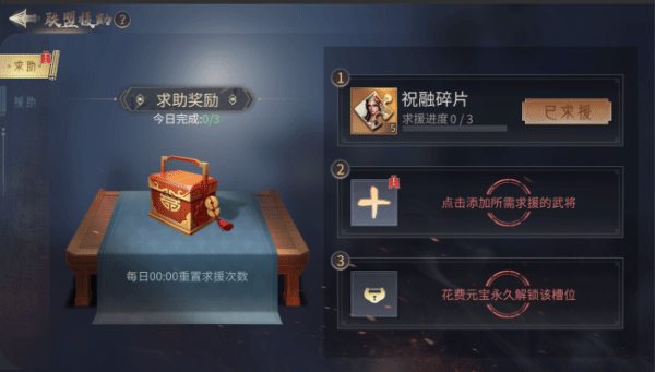 各位主公每日皆可发起联盟援助,借此获取自己心仪的指定将领碎片,每天最多发起三次。与此同时,玩家还能够协助联盟内其他军团的成员。