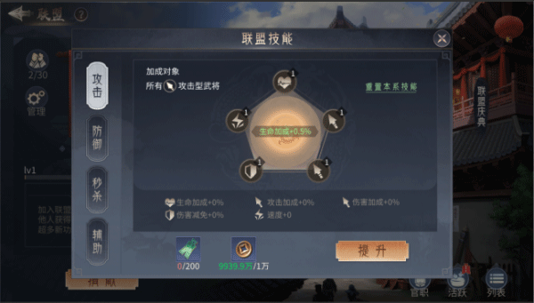 各位主公还可以消耗联盟贡献和铜钱可以对不同职业的武将进行数值提升