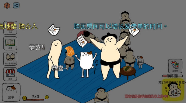 然而,想要吸引相扑选手来用餐并非易事。玩家需不断点击右下角,直至进度条满格,才能迎来一位客人。成功招揽客人会吸引更多相扑选手前来消费,玩家从中赚取的金币,可用于研发各类高级菜品,或是购置家具,提升相扑选手的舒适度,同时还能拓展除餐饮之外的金币获取途径。