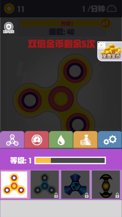 2、满足上述圈数要求就能获取金币,点击右下角的陀螺图标,可解锁更多指尖陀螺样式。