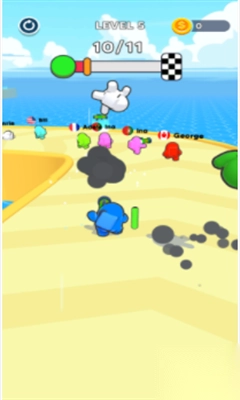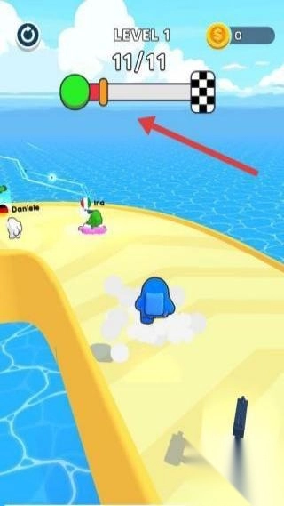 1、在【LEVEL1】开局阶段,操控蓝色角色沿沙滩赛道前进,按箭头方向跑,避开水域,推进进度至【8/11】。