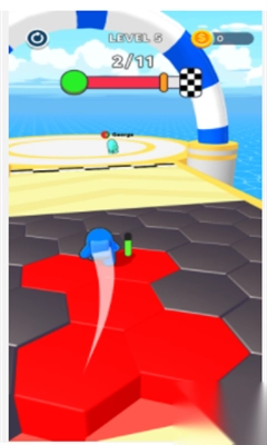 2、进度到【11/11】时,操控蓝色角色超白色等对手,沿赛道前行,别掉落,按箭头方向冲刺。