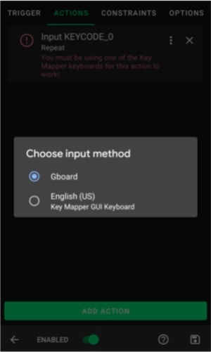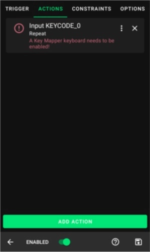 在这个简单的演示里,我会从KEYCODE选项卡中选取KEYCODE_0 。此操作将模拟按下键盘上的0键。键映射器会告知你是否需要执行额外步骤,以使操作能够正常进行。从图片中可以看到,操作过程中出现了一条错误消息,提示“启用”一个键映射器键盘。轻点该操作,就能引导你到达正确的位置,方便你修复错误。接下来,我将讲解如何设置关键代码动作,因为这些动作最为常用。