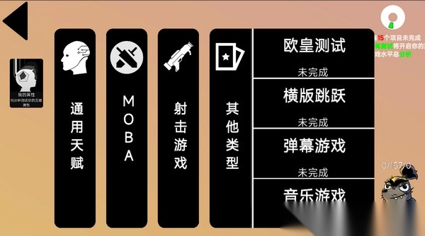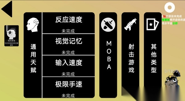 2、现阶段总共有四大测试分类,通用、MOBA、射击及其他类型,每种都有4个测试项目,全部测试完毕即可得出总成绩并分享
