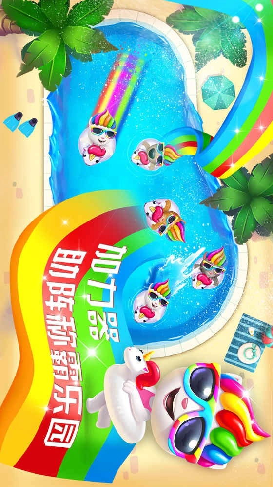用加力器取胜吧!火箭可自动消除同种颜色的所有泳圈,强大的独角兽加力器可让所有泳圈统一成彩虹色。