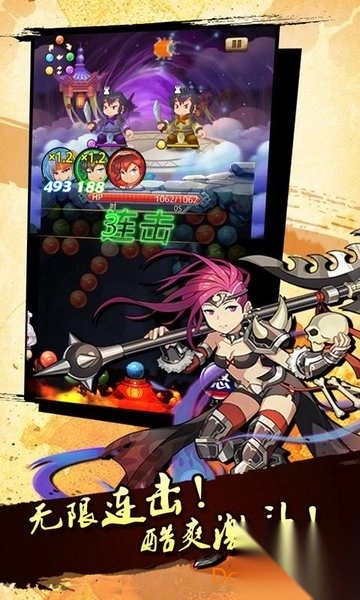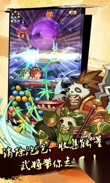 本游戏的核心玩法:消除您所携带的武将对应属性的泡泡能提升您的武将的攻击力并且能为其技能进行充能!