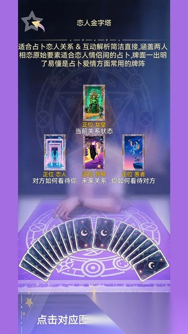 1通过运用22张大阿尔卡那牌,并借助传统的占卜手段,为玩家预测各类运势。
