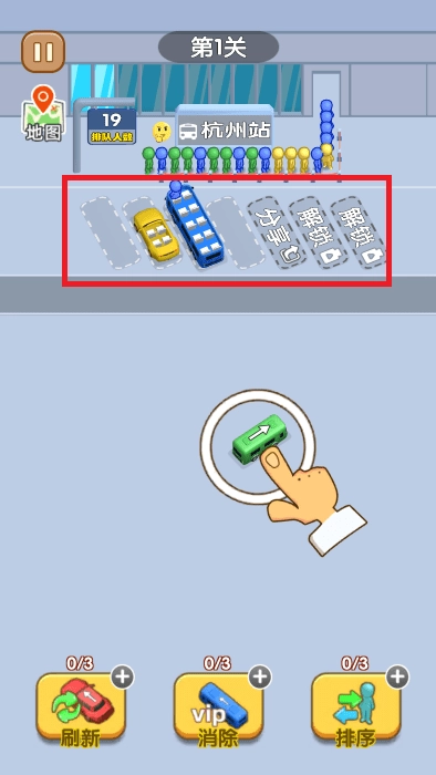 你在这里可以看到,排队乘客的颜色和车辆颜色,乘客入座只能按第一个颜色开始入座的。