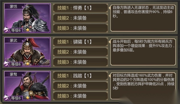 2、蒙恬、蒙武、蒙骜组成紫色重骑羁绊部队。重骑的突出优势在于具备可靠的坦度,能够对远程方阵发起冲锋。然而,该部队自身没有回复技能,辅助技能大多选择佩戴具有回复效果的辅助技能,主要用于在前排冲锋并承担抗线任务。