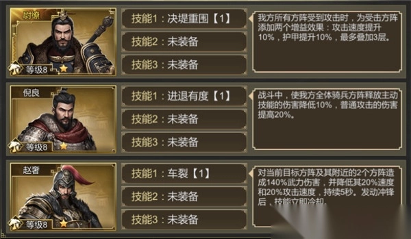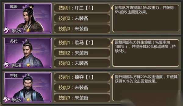 1、庞暖、苏代、宁越:同部队触发羁绊效果,攻击时自带回复效果,且提升一定攻速和攻击力,本阵容初期骑兵回复型开荒队伍,获取门槛低,适合任意玩家前期过度使用。