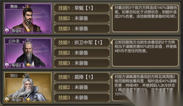 1、惠施、公孙龙、邹衍:同部队羁绊提升谋略10%,对于齐国国家天赋有一定小优势。惠施辅助技能必带一个点燃技能,提升输出能力配合上邹衍,冰火策士,初期扫野伤害客观,公孙龙则主要提供恢复和保护效果。