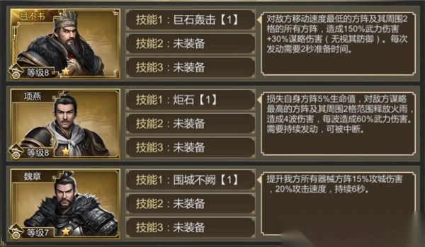 3、吕不韦、项燕、魏章:金色投石车羁绊队伍,作为极高16攻城值的部队,属于高阶攻城部队,辅助技能佩戴多以提升同部队攻城伤害为优先配置。