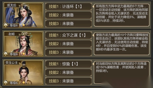 2、宣太后、赵姬、荧玉公主组成金色女策士羁绊队伍,能提升同部队的谋略与士兵护甲。宣太后主要针对敌方高武力单位,使其无法释放技能,并削弱其一定基础属性。赵姬配合宣太后,不仅增加敌方无法释放技能的方阵数量,还附带高谋略伤害增伤效果。荧玉公主则助力达成控场效果,且自身伤害不容小觑。荧玉公主在选择辅助技能时,既可以挑选暴力输出类技能,也能多佩戴控制技能。