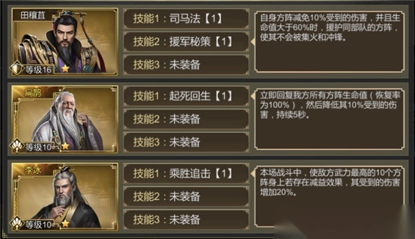 1、田穰苴、扁鹊、李冰:双策士触发羁绊提升谋略,田穰苴额外再提升谋略,最大化提升扁鹊恢复能力,田穰苴辅助技优先佩戴援军密策,保护同部队不被骑兵冲锋,大大增加了存活率。