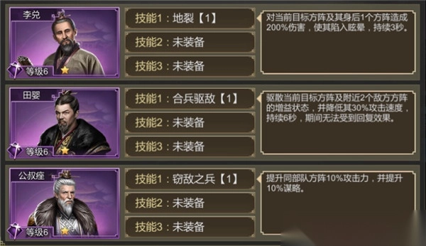 1、李兑、田婴、公叔座:紫色戟兵羁绊部队,增加了少许攻击力和护甲,李兑控制2个目标方阵长达3秒,田婴则主要驱散3个目标增益效果和减攻速,期间并禁疗。但因紫色品质输出能力偏低,主要以控制和驱散为主。